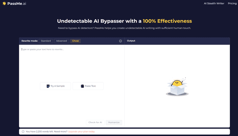 PassMe.ai tilbyder også tre forskellige humaniseringstilstande. Der er Standard-tilstanden til hurtig og nem humanisering, Advanced, hvis du har brug for dybere og mere detaljerede ændringer, eller den topmoderne Ghost-model til at få 100% menneskelige scores på selv de strengeste detektorer, som Turnitin. Dette værktøj genererer også kun originalt indhold, så der er ingen risiko for plagiat.
