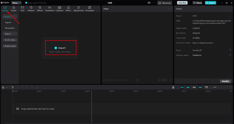 Når du har downloadet og installeret CapCut desktop video editor, skal du logge ind med dit e-mail-id, Google-id eller TikTok-konto. Derefter skal du importere din ønskede video ved at klikke på knappen "Importer".