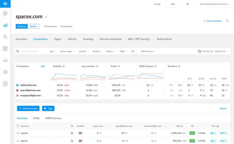Be šių įrankių, vertingų įžvalgų gali suteikti ir konkurentų naudojamų raktažodžių analizė. Išanalizuokite jų turinį ir nustatykite konkurencingus raktažodžius, pagal kuriuos jie užima aukštesnes pozicijas, kad sukurtumėte pradinį tyrimo tašką.